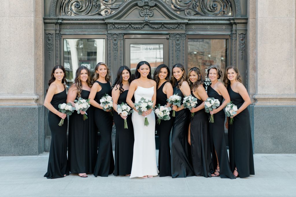- Letting my bridesmaids pick their own dresses. I had nine bridesmaids and the chances that nine different women would feel comfortable in one dress is extremely rare. As long as it was black and to the floor I didn’t care if they spent $50 or $500 on their dress, it was up to them. Yes, they did run them by me and I helped to make sure not everyone had strapless/one shoulder, etc. They looked beautiful and the amount of time and money they spent to celebrate with us meant the world to me so this was honestly something so small that I think they really appreciated.