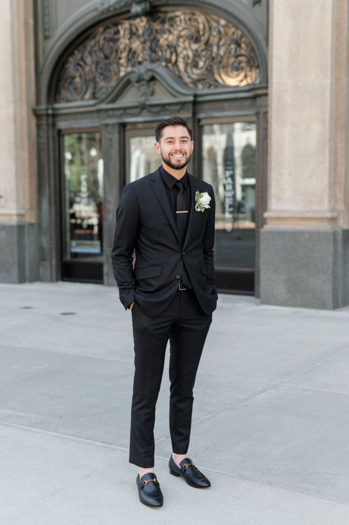 Color/Theme: Black. Jon was in all black, our groomsmen were in black suits with white shirts and the bridesmaids were in black dresses of their choice.